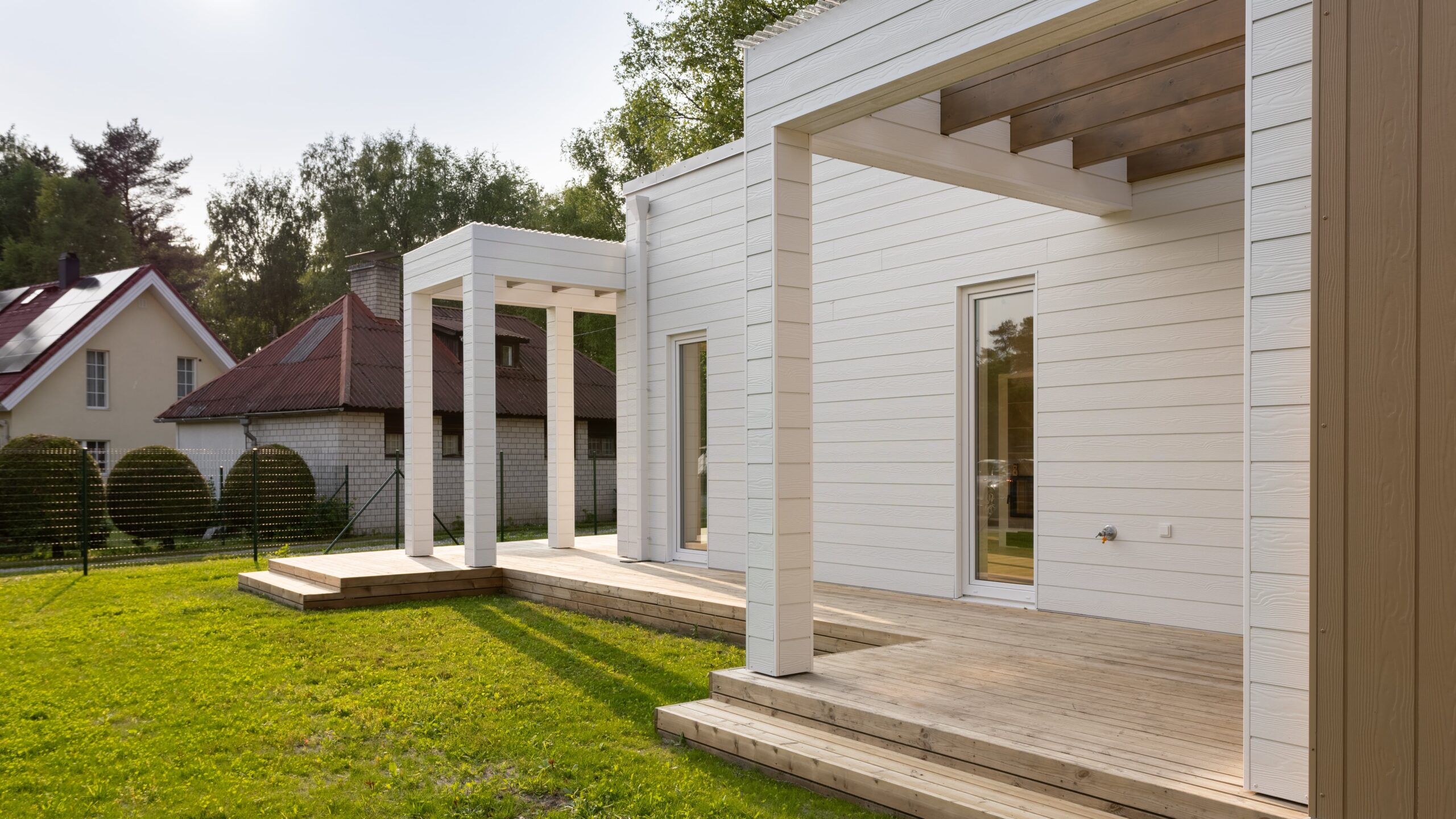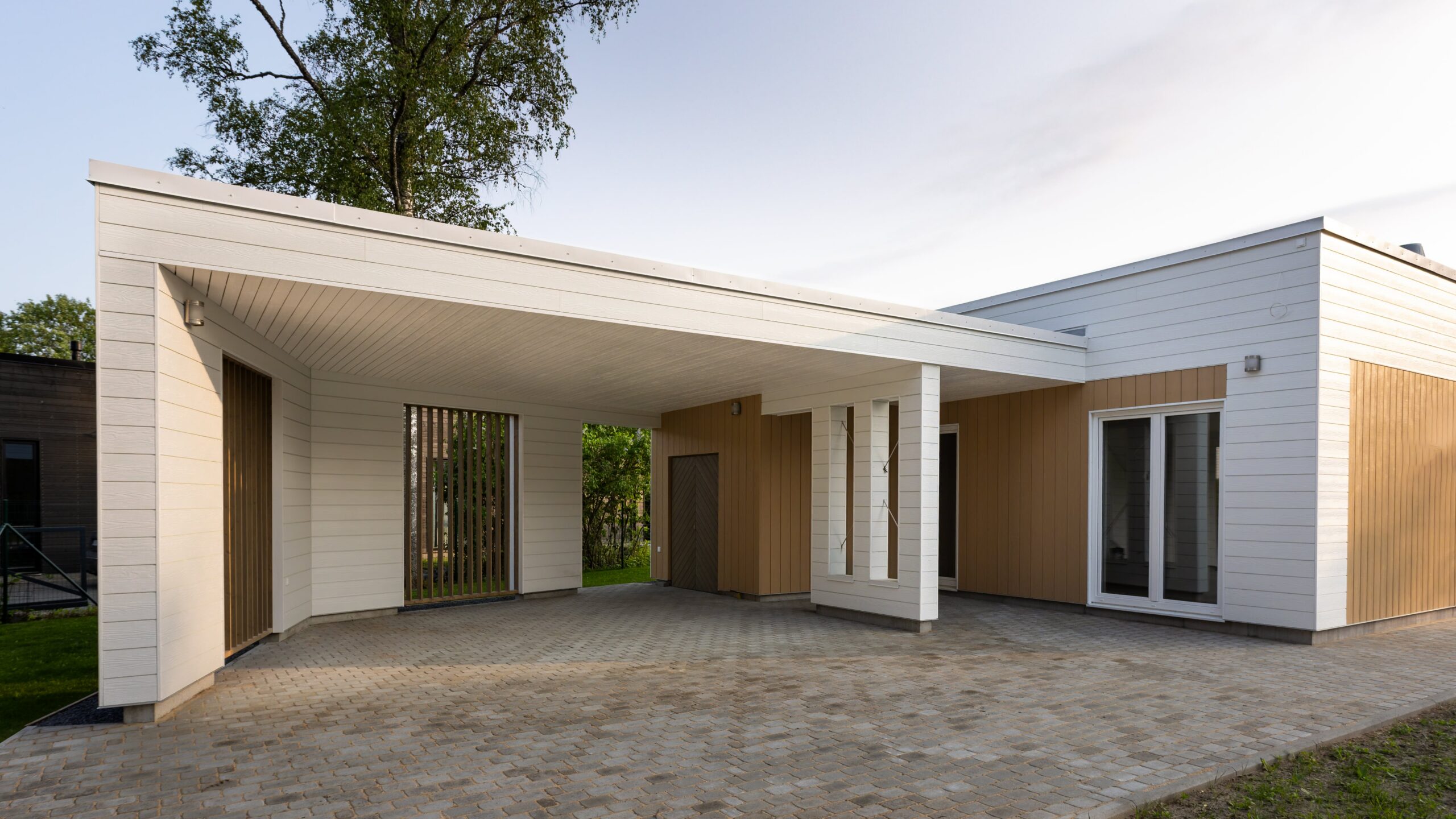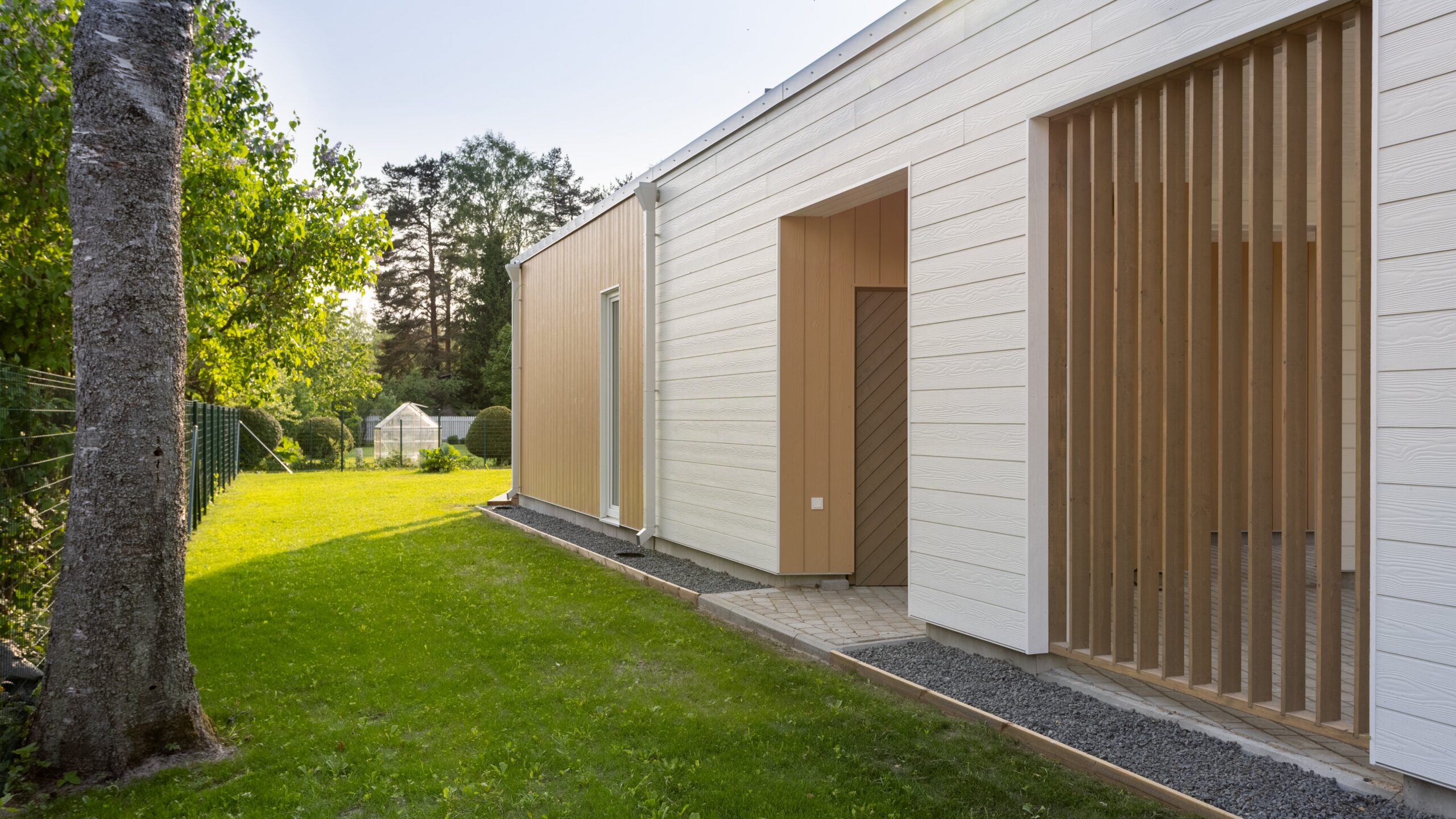 Elamu fassaadil on valge põhi ja liivakollane aktsent, mis loovad värviküllaselt sooja terviku.