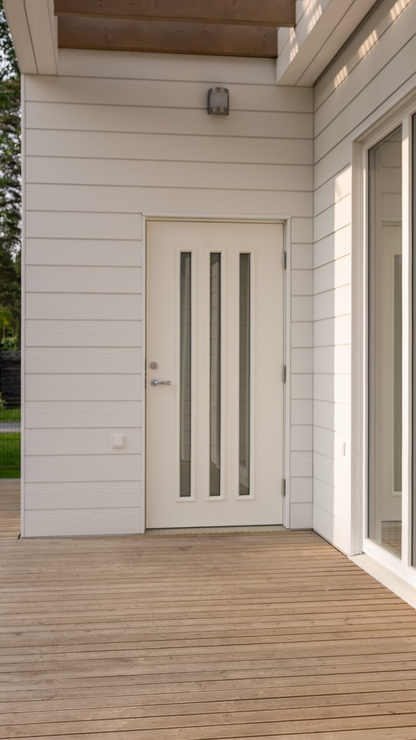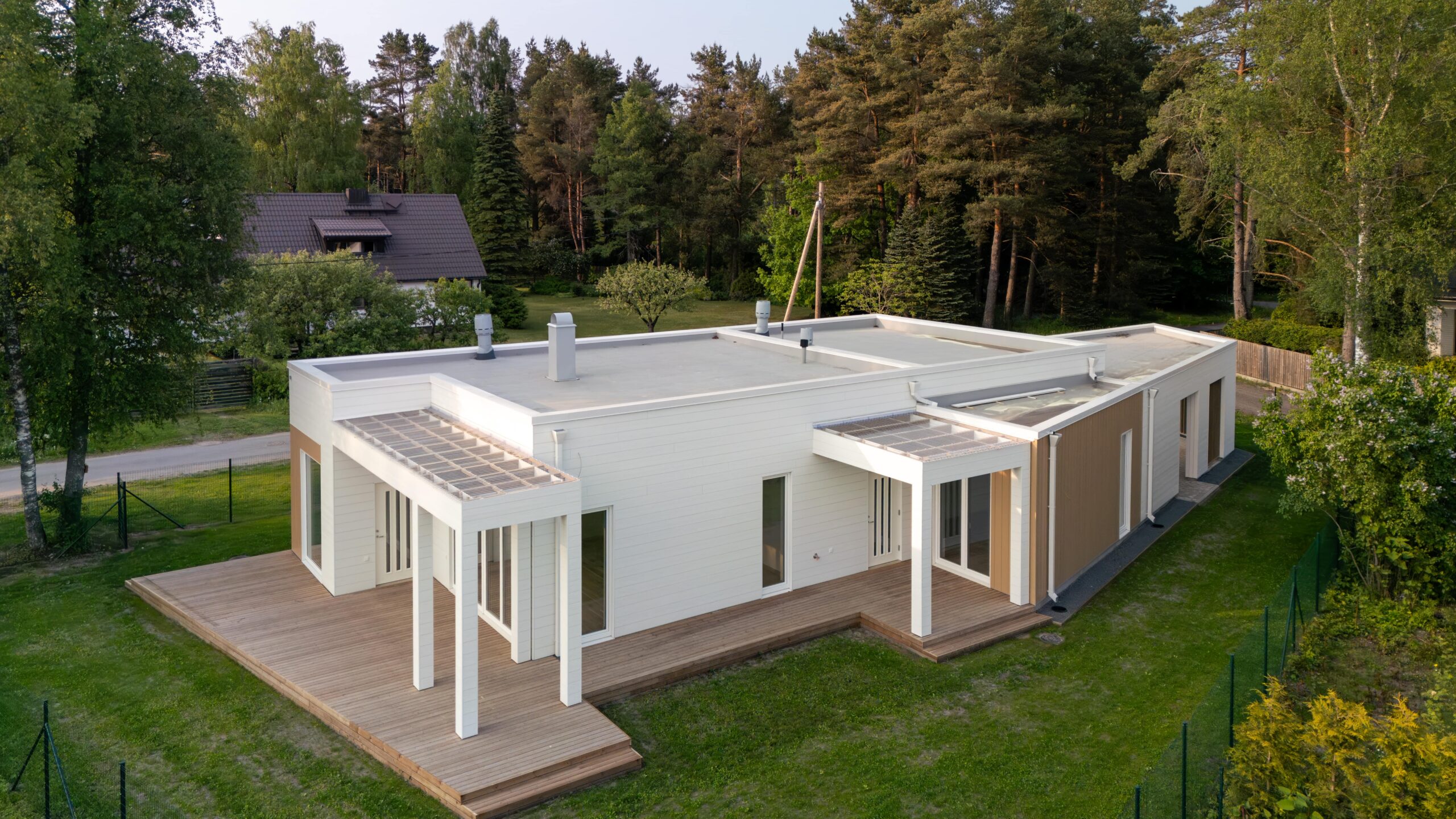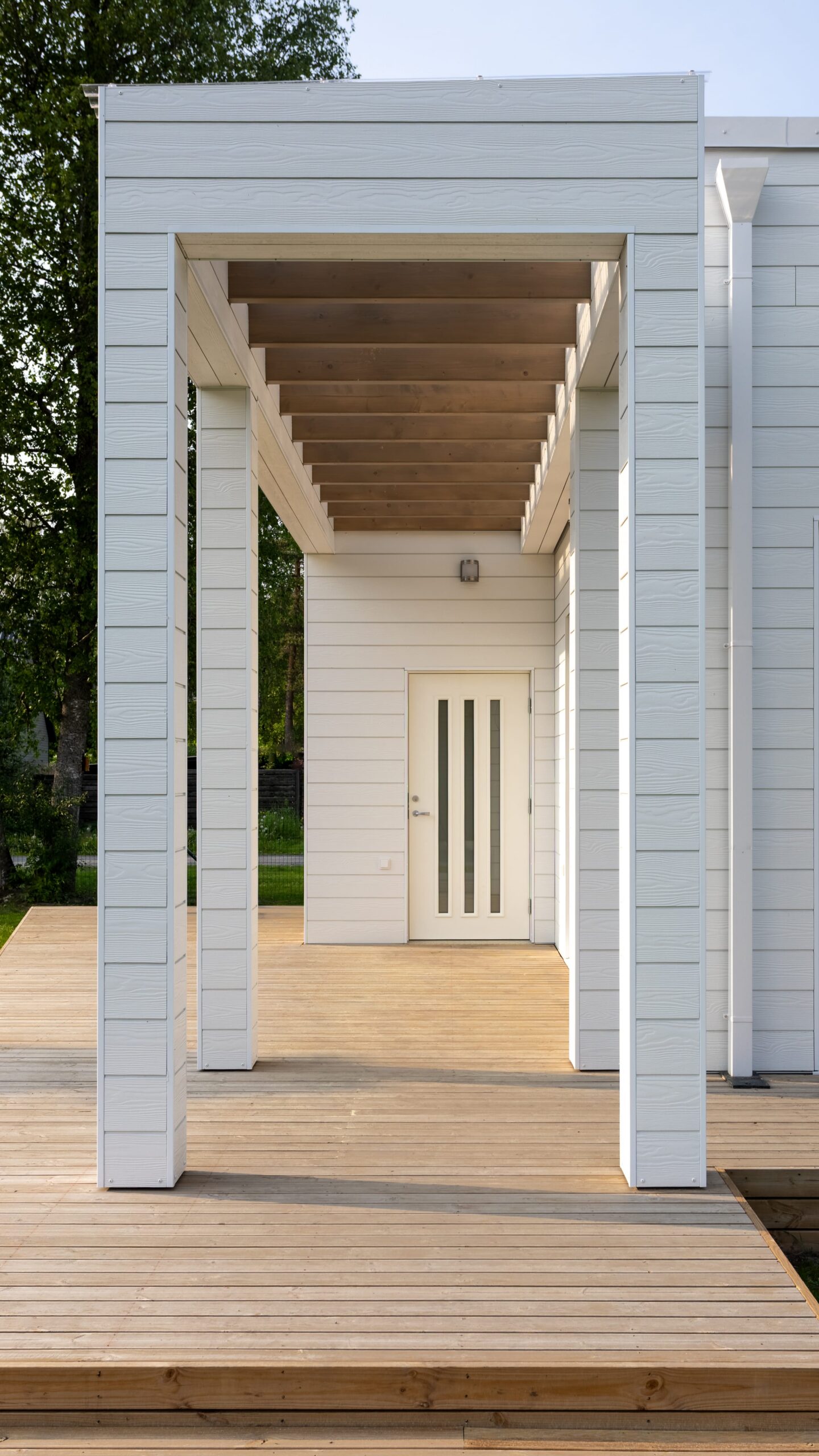 Elamu fassaadil on valge põhi ja liivakollane aktsent, mis loovad värviküllaselt sooja terviku.