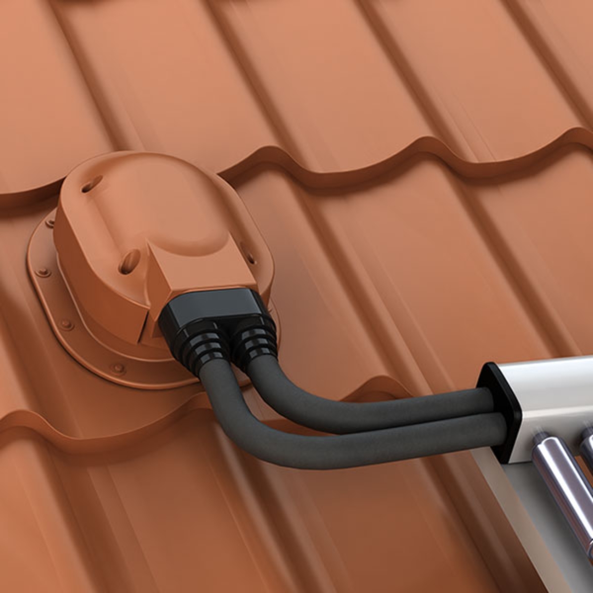 Päikesepaneeli ühenduse komplektis on: päikesepaneeli ühendus, sobiv katuseühendus/alune, must EPDM-kummist otsik.