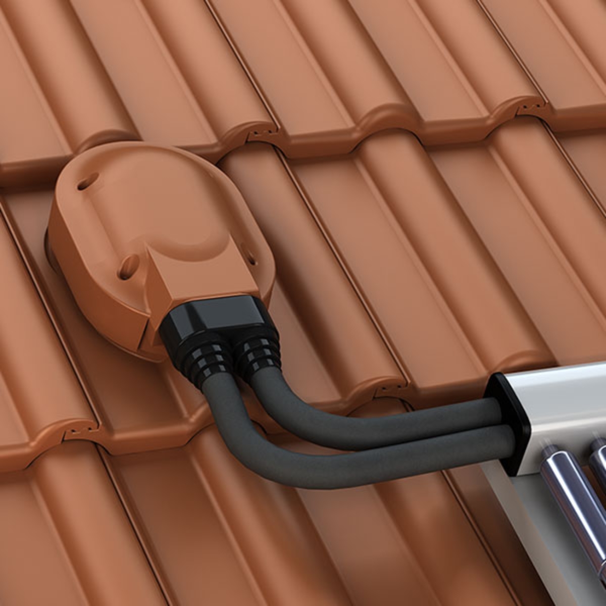 Päikesepaneeli ühenduse komplektis on: päikesepaneeli ühendus, sobiv katuseühendus/alune, must EPDM-kummist otsik.