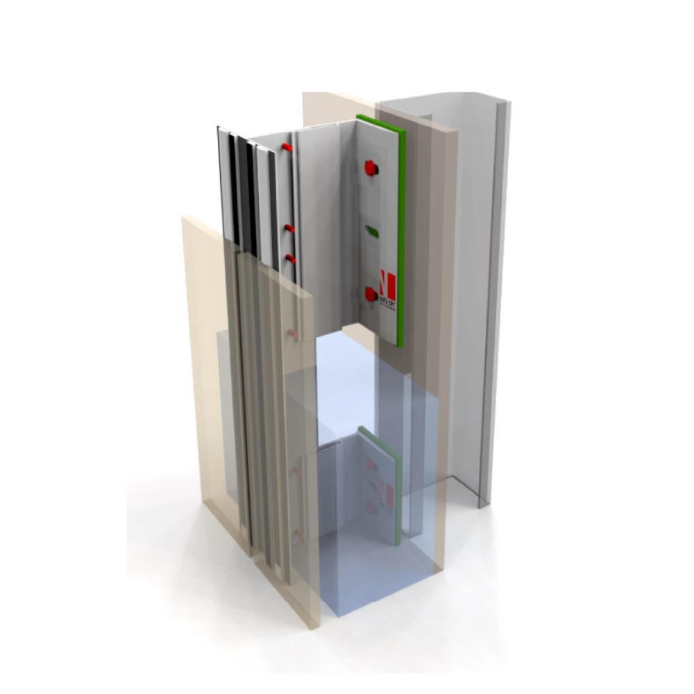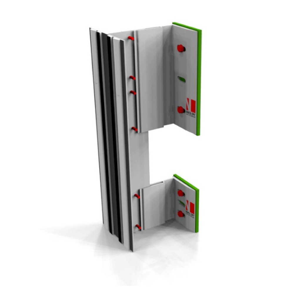 NVELOPE klambrid (V): võimaldab reguleerida esmast toe esipinna ja vertikaalse profiili välispinna vahel. Soojusisolaatorid: standardina kokkupandud kõva PVC-isolaator (asub NVELOPE klambrite ja konstruktsioonisüsteemi vahel).