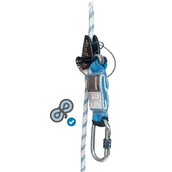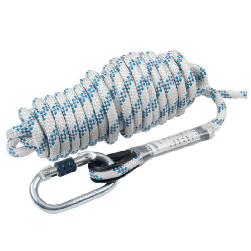12 mm kukkumise peatamise köis, vastupidav teravatele servadele, varustatud alumiiniumist kruvikarabiini ja tellingukonksuga. |